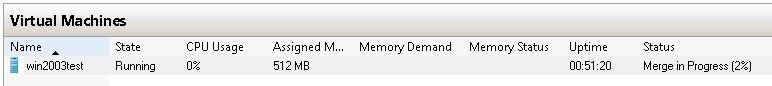 Логично предположить, что если мы будем удалять второй снимок – то в его файл должно вставиться изменение состояния виртуальной машины из третьего файла. Если будем удалять только первый снимок – то второй файл будет объединён с первым. Попробуем удалить снимок “win2003test”. После удаления в поле статуса виртуальной машины появится текст “Merge in Progress”: