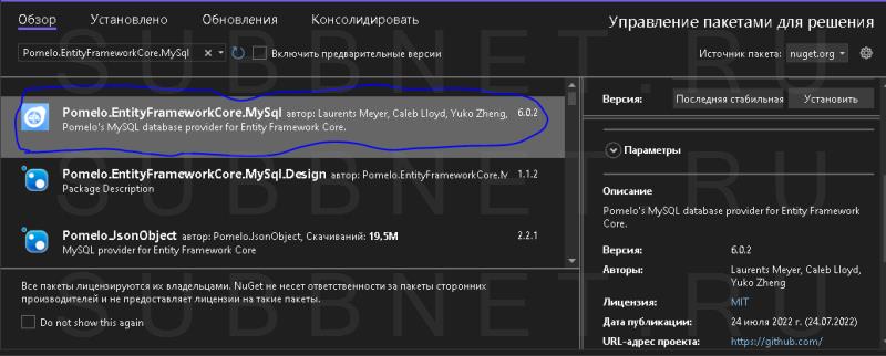 На данный момент для работы с MySQL имеется несколько провайдеров, но в данном случае мы будем использовать провайдер Pomelo.EntityFrameworkCore.MySql от Pomelo Foundation Project. Стоит отметить, что на данный момент (18 ноября 2020) для версии EF Core он пока в предрелизном состоянии, поэтому мы будем использовать предрелизную версию.