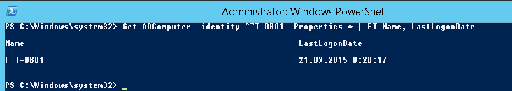 Get-ADComputer -identity SRV-DB01 -Properties * | FT Name, LastLogonDate -Autosize