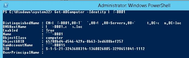 Чтобы получить информацию о конкретном компьютере укажем его имя с параметром -Identity: