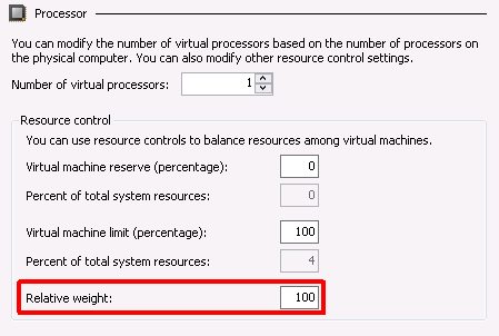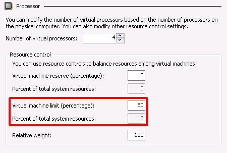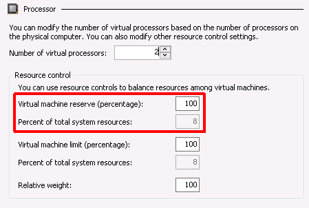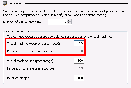 Работает этот параметр следующим образом. Возьмем виртуальную машину, выделим ей 2 виртуальных процессора и установим Virtual Machine Reserve равным 100. Это значит, что от физически имеющихся ресурсов этой виртуальной машине зарезервировано 100 % от 2 ядер, или 8% от общей процессорной мощности. Это значение отображается в поле «Percent of total system resources».