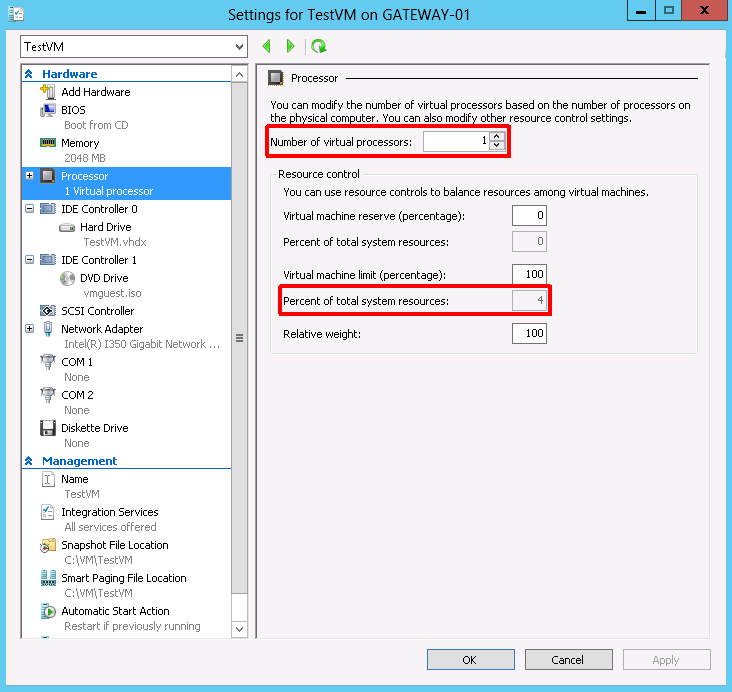 Открываем оснастку Hyper-V Manager и заходим в настройки виртуальной машины, на вкладку Processor. Обратите внимание на параметр Percent of total system resources — он показывает, какой процент от общей процессорной мощности выделен конкретно этой виртуальной машине. В нашем случае это 1/24 = 4% . Если выделить машине второй процессор, то получим 8%, третий — 12% и т.д. Таким способом мы управляем распределением процессорных ресурсов между виртуальными машинами.