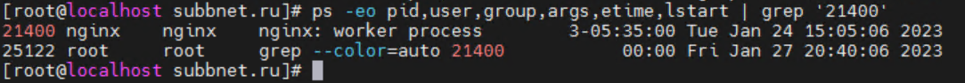 ps -eo pid,user,group,args,etime,lstart | grep '21400'
