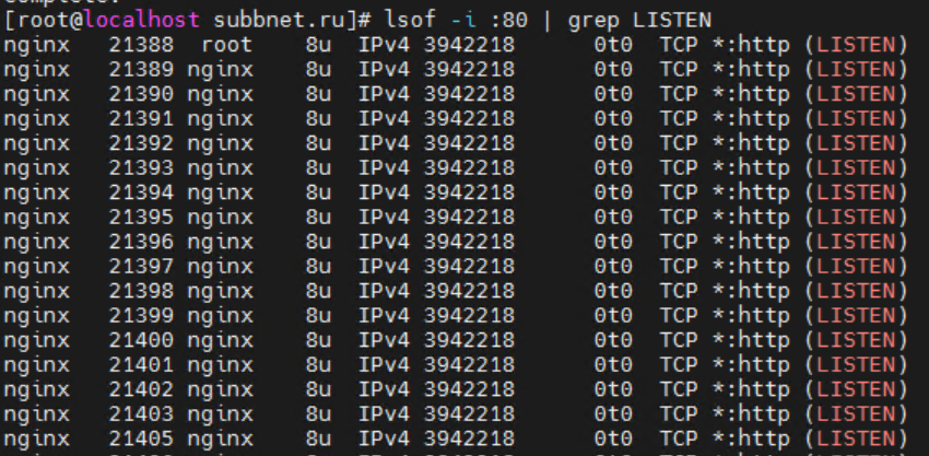 lsof -i :80 | grep LISTENРезультат выполнения: