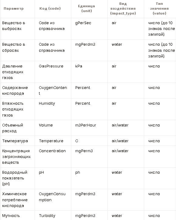 format_version: Версия схемы данных.amsstate: Состояние автоматических средств измерения (АСИ).pollutant_uuid: Уникальный идентификатор загрязняющего вещества (внутриparameters).equipment_uuid: Уникальный идентификатор технологического оборудования (внутриsources).