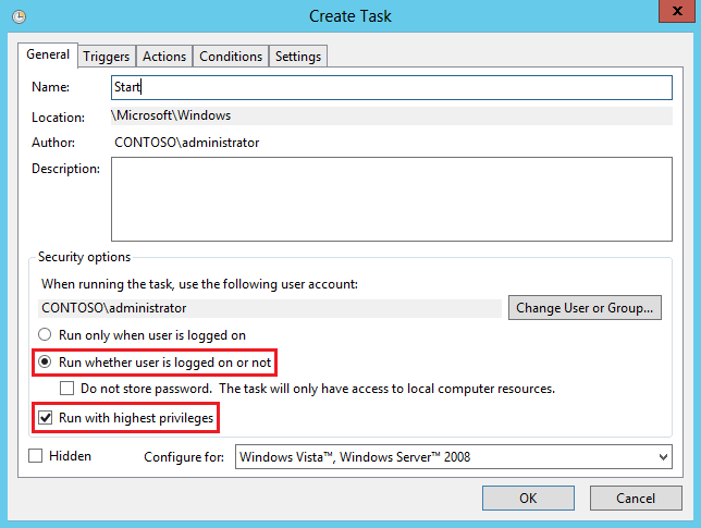 На вкладке General указываем имя и описание задания, а также (по необходимости) пользователя, от имени которого задание будет запускаться. Для того, чтобы задание выполнялось вне зависимости от того, залогинен ли пользователь в системе, выбираем опцию «Run whether user is logged on or not». Если для выполнения задания требуется повышение привилегий, то отмечаем опцию «Run with highest privileges».