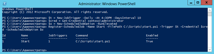 $cred = Get-Credential contoso\administratorВ качестве опции указываем запуск задания с повышенными привилегиями: