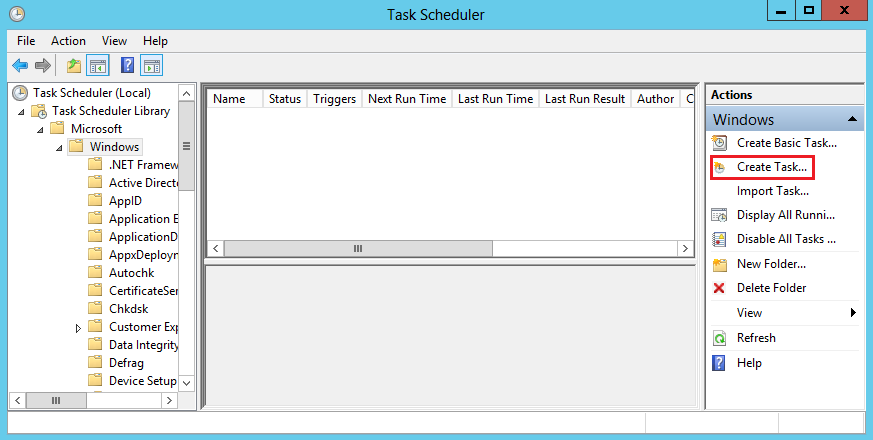 Для запуска скрипта воспользуемся оснасткой Task Scheduler, он же планировщик заданий. Найти его можно в разделе Administrative Tools, либо нажав Win+R и введя команду taskschd.msc. Открываем планировщик и в разделе Actions выбираем пункт Create Task.