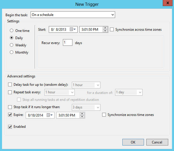 Далее идем на вкладку Triggers и создаем новый триггер, в котором будет храниться расписание запуска нашего задания. В поле Start указываем дату и время запуска, а в поле Expire — дату и время завершения задания. Указываем выполнять задание ежедневно (Daily) и задаем период повтора (Recur every) 1 день.