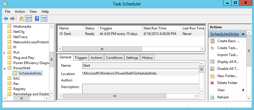 Чтобы убедится в том, что задание создано, можно открыть планировщик и найти наше задание в разделе Microsoft\Windows\PowerShell\SheduledJobs.