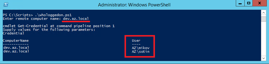 }Запускаем скрипт, указываем имя компьютера, учетные данные для подключения и получаем список пользователей, залогинившихся на этом компьютере.