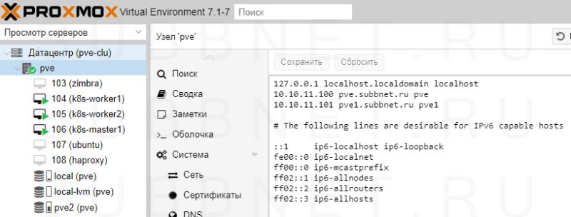 Серверы должны иметь возможность обращения друг к другу по их серверным именам. В продуктивной среде лучше всего для этого создать соответствующие записи в DNS. В тестовой можно отредактировать файлы hosts. В Proxmox это можно сделать в консоли управления — устанавливаем курсор на сервере - переходим в Система - Hosts - добавляем все серверы, которые будут включены в состав кластера: