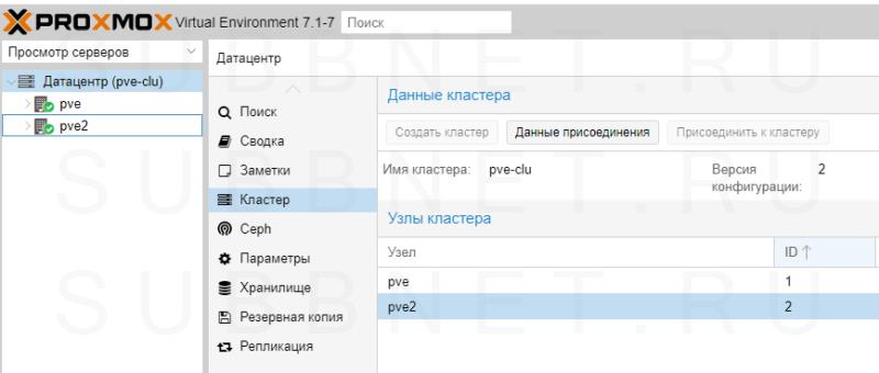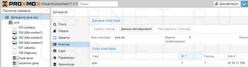 Теперь переходим в панель управления нодой, которую хотим присоединить к кластеру. Переходим в Датацентр - Кластер - кликаем по Присоединить к кластеру: