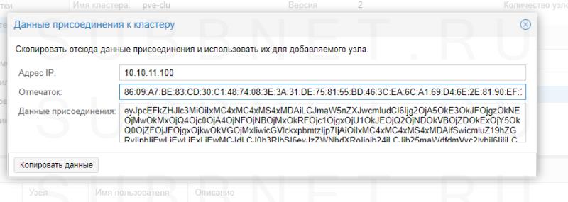 В поле «Данные» вставляем данные присоединения, которые мы скопировали с первой ноды — поля «Адрес сервера» и «Отпечаток заполняться автоматически». Заполняем пароль пользователя root первой ноды и кликаем Присоединение: