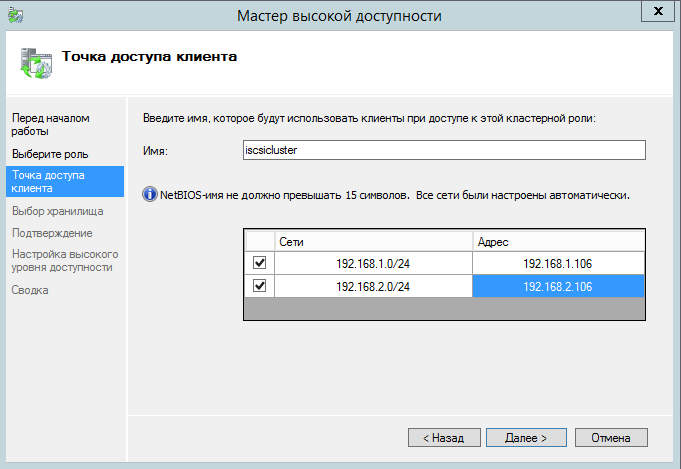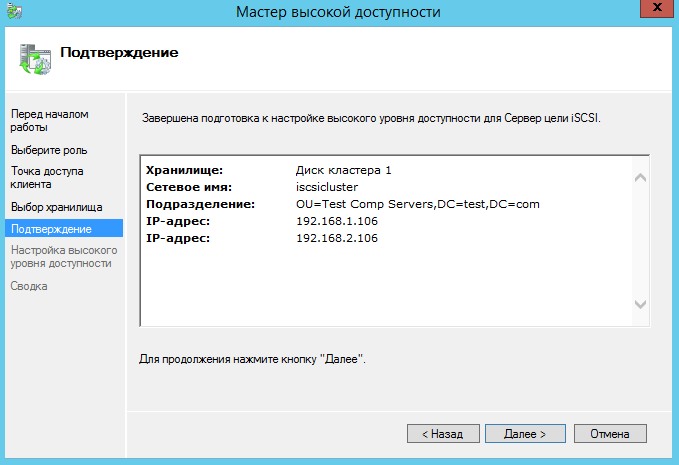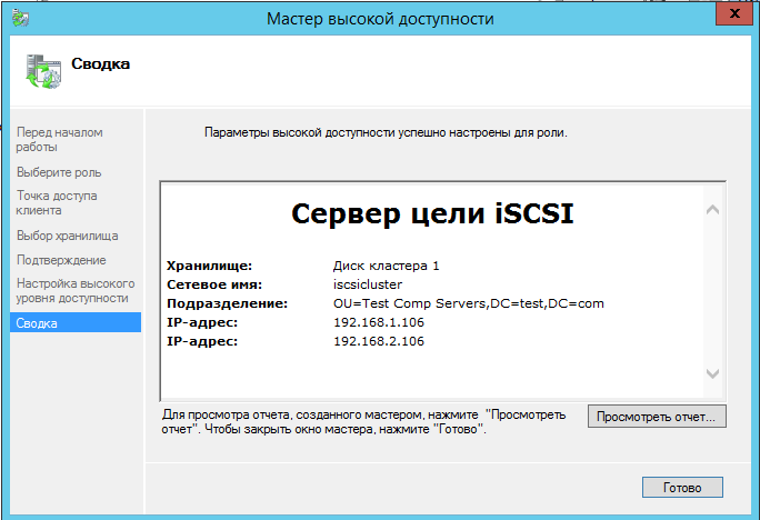 Готово! Теперь указанные клиенты могут подключаться к кластеру ISCSI. Для подключения нужно использовать DNS имя кластера.