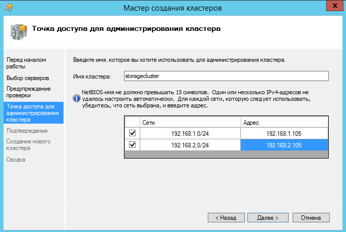 Указываем название кластера и сетевые адреса.