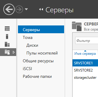 На одном из узлов кластера открываем диспетчер сервера, в нем открываем файловые службы и выбираем ISCSI.
