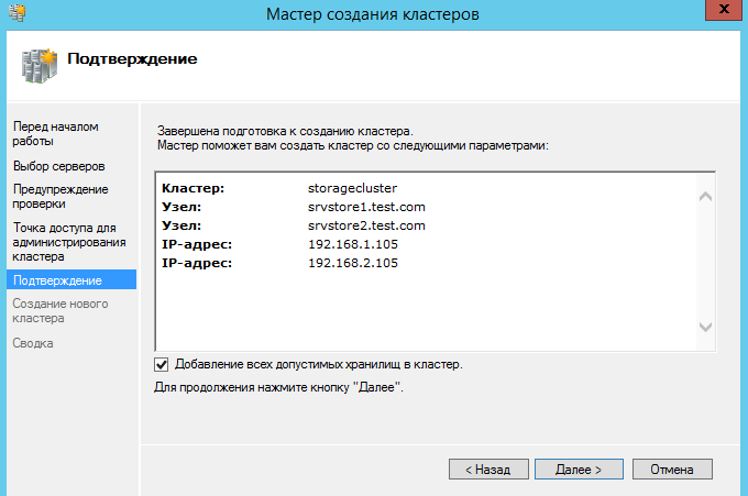 Создаем кластер. Обязательно добавляем все допустимые хранилища.