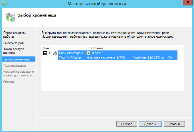 Выбираем кластер и общий кластерный диск.