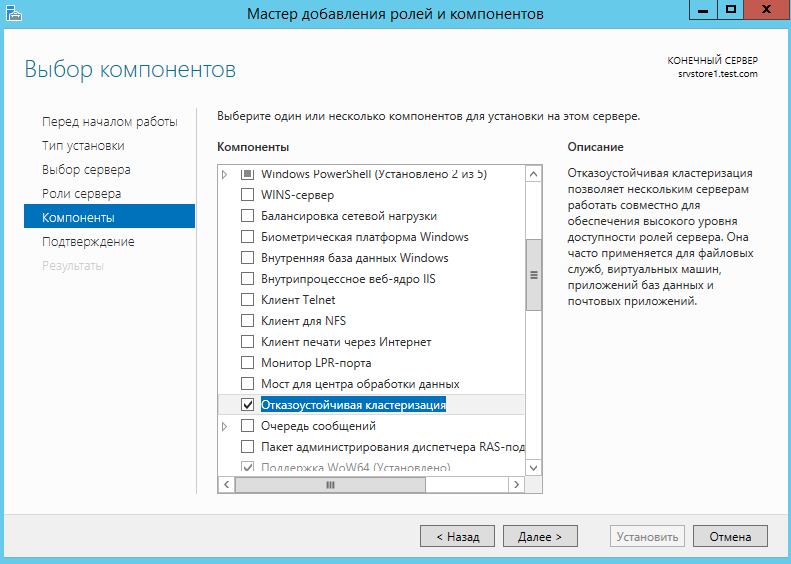 На первом сервере включаем компонент «отказоустойчивая кластеризация»