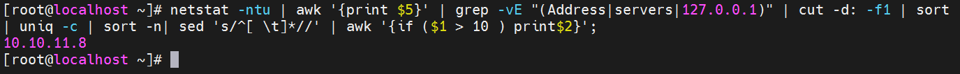 netstat -ntu | awk '{print $5}' | grep -vE "(Address|servers|127.0.0.1)" | cut -d: -f1 | sort | uniq -c | sort -n| sed 's/^[ \t]*//' | awk '{if ($1 > 10 ) print$2}';