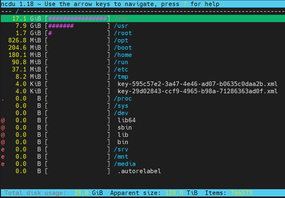 ncdu / - удобный просмотр сколько занимает места файлы/папки и поддиректории, ключ -x исключит из поиска смонтированные директории