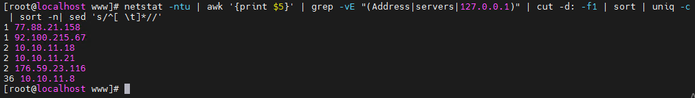 cat /var/log/nginx/access.log | awk '{print $1}' | sort -n | uniq -c | sort -n | tail -n100 | awk '{if ($1 > 10 ) print $2}'Список установленных соединений с сервером. Бывает нужно, когда есть подозрения на взлом и какую-то паразитную активность. В этом примере не вычисляется количество соединений, а просто приводится список уникальных ip адресов, с которыми установлено соединение.