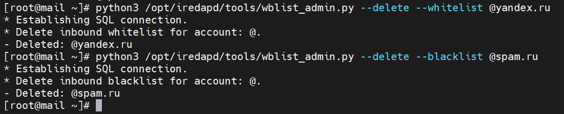 python3 /opt/iredapd/tools/wblist_admin.py --delete --blacklist @spam.ru