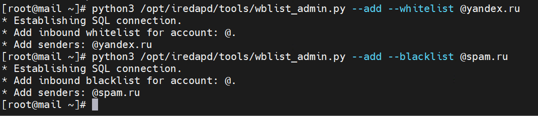 python3 /opt/iredapd/tools/wblist_admin.py --add --whitelist @yandex.ru