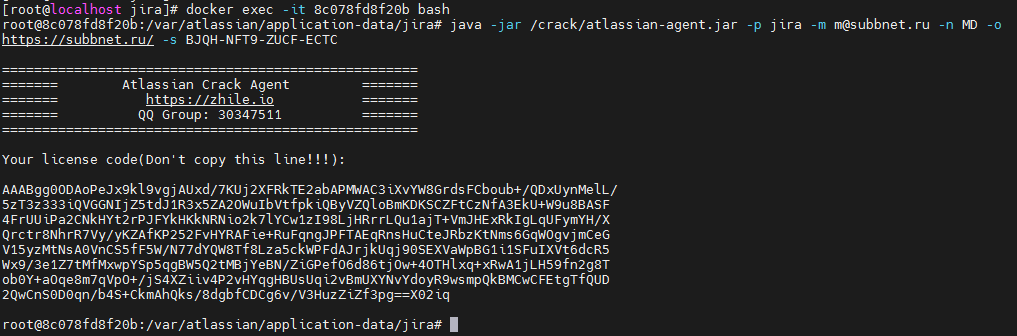 java -jar /crack/atlassian-agent.jar -p jira -m m@subbnet.ru -n MD -o https://subbnet.ru/ -s BJQH-NFT9-ZUCF-ECTCИ получаем результат.