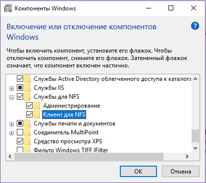 В появившемся списке в разделе Services for NFS включите NFS клиента (Client for NFS), а затем нажмите «ОК».