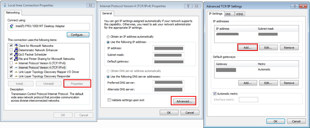 Напомню, что для добавления адреса к сетевой карте в GUI необходимо зайти в свойства сетевой карты, свойства протокола TCP/IPv4 и там - в Дополнительно и Добавить: