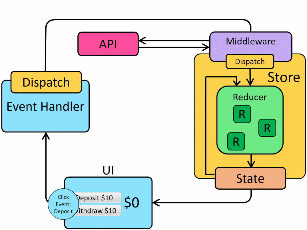 Redux помогает вам управлять глобальным состоянием вашего приложения. Он эффективно изучает поведение логики приложения в ответ на внесенные изменения. На рисунке ниже показан процесс Redux вашего приложения.