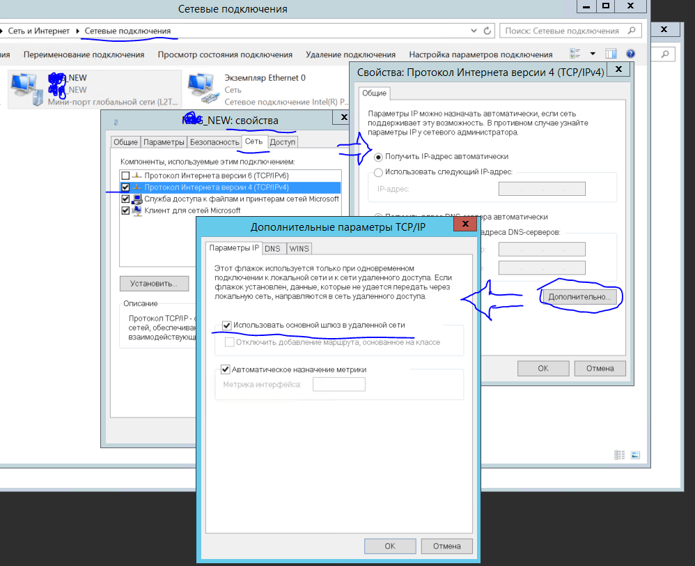 Пользователи при подключении из дома к корпоративному VPN серверу жалуются, что у них не работает доступ в Интернет со своего компьютера при активном VPN подключении. В этой статье мы разберемся, почему пропадает доступ в Интернет в Windows 8-10 при подключении к VPN и как исправить эту проблему. При создании нового VPN подключения в Windows (всех версий) в его настройках по умолчанию включена опция “Использовать основной шлюз удаленной сети” (Use default gateway on remote network). Это означает, что весь трафик с вашего компьютера отправляется через VPN туннель. Если на VPN сервере для удаленных клиентов разрешен доступ только к локальным ресурсам предприятия, и запрещен доступ в Интернет, то у пользователя на компьютере не будут открываться внешние веб-сайты и другие Интернет ресурсы. Соответственно, после отключения от VPN, весь трафик пользователя пойдет через обычную сеть и у него появится Интернет-доступ.