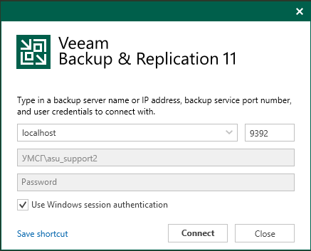 Критерием успешного завершения работы процедуры установки является успешный запуск консоли Veeam Backup & Replication и непосредственное подключение к серверу: