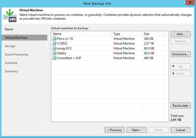 Выбираем нужные виртуальные машины и настройки как, когда, куда и зачем делать резервное копирование..