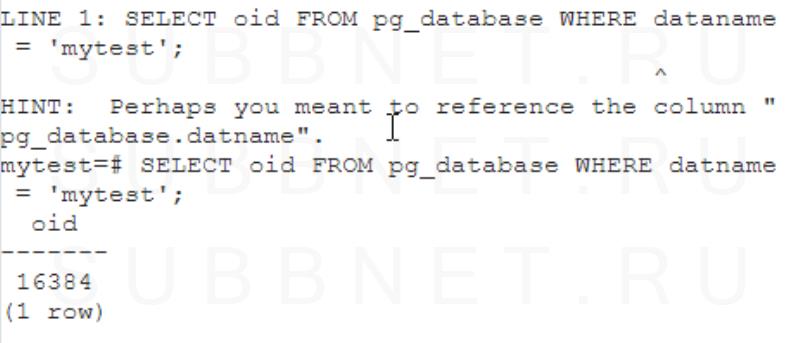 SELECT oid FROM pg_database WHERE datname = 'mytest'