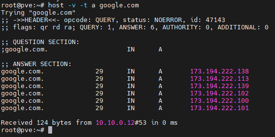host -v -t a google.com