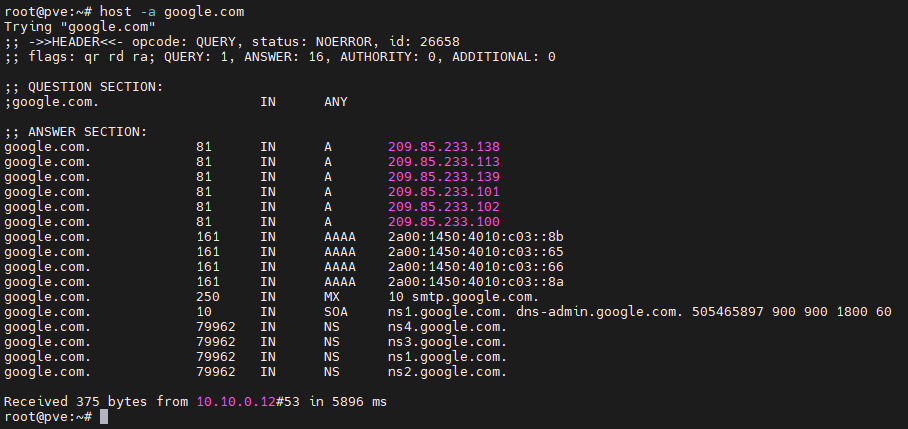 host -a google.com