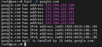 host -4 google.com