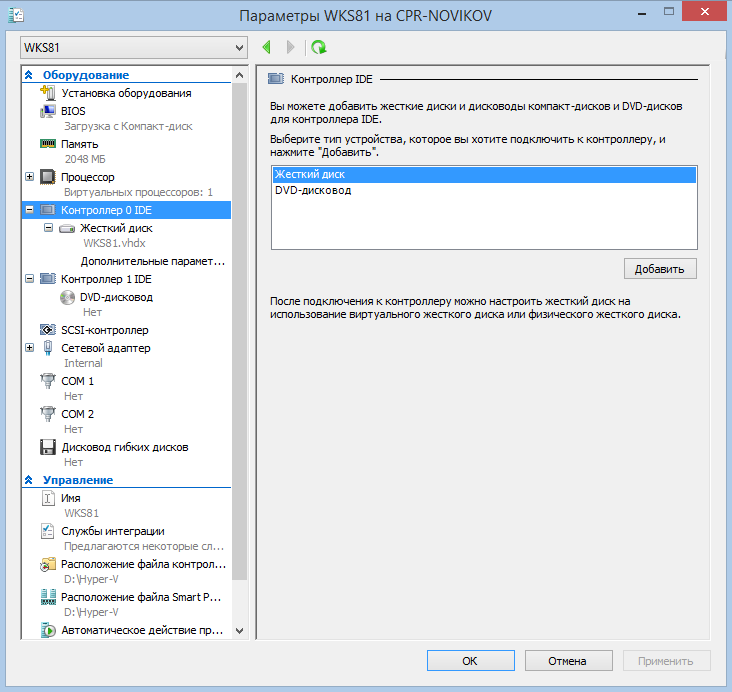 Для того, чтобы подключить к ВМ виртуальный жесткий диск или DVD выбираем соответствующий контроллер, выделяем нужное устройство и жмем «Добавить».