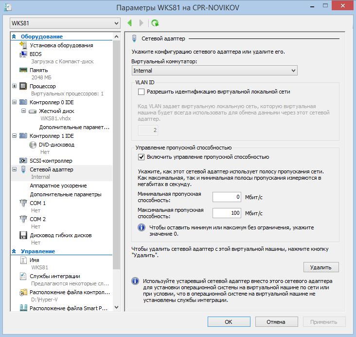 Кроме того, для каждого виртуального сетевого адаптера можно включить управление пропускной способностью сети и указать минимальные и максимальные значения.