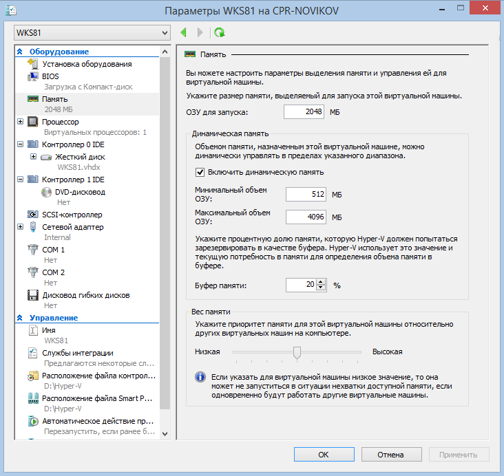 Использование динамической памяти позволяет более гибко управлять распределением памяти. К примеру, для гарантированного запуска машине можно выделить 4ГБ памяти, а на случай бездействия задать минимум в 512МБ. Кстати, максимальный и минимальный объем памяти можно изменять на живую, прямо в процессе работы ВМ.