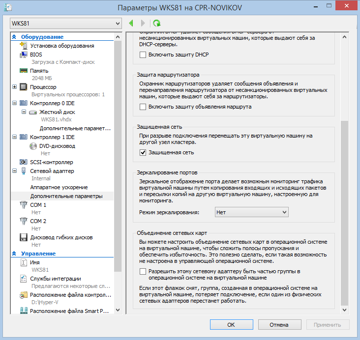• Объединение сетевых карт (NIC Teaming) — технология, позволяющая объединить несколько физических адаптеров в группу, обеспечив отказоустойчивость и увеличение пропускной способности. В Windows 8.1 нет возможности включить NIC Teaming на уровне хоста, и эта настройка позволяет задействовать его на уровне виртуальной машины. К примеру, если в ВМ есть два виртуальных сетевых адаптера, подключенных через два виртуальных коммутатора типа External к двум разным физическим сетевым адаптерам, то можно сконфигурировать NIC Teaming внутри виртуальной машины. Для того, чтобы Hyper-V понимал, что адаптеры объединены в группу, и нужно включить данную настройку в свойствах каждого виртуального адаптера, входящего в тайминг. Эта возможность работает только в том случае, если в качестве гостевой ОС используется Windows Server 2012. Подробности работы и настройка NIC Teaming в Windows Server 2012.