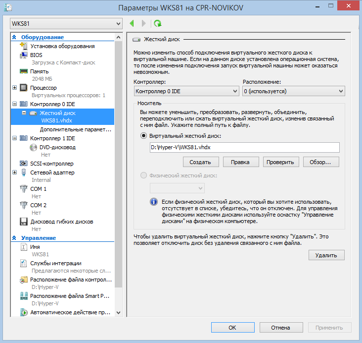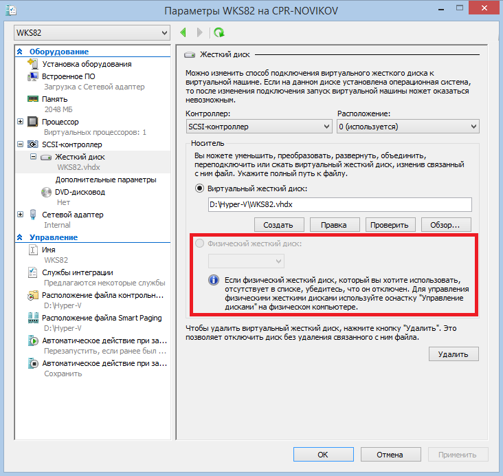 Также в Hyper-V есть возможность подключить к любому из контроллеров в виртуальной машине физический жесткий диск напрямую, минуя основную систему. Для этого надо отметить соответствующий пункт и выбрать из списка диск. Для того, чтобы этот выбор был доступен и диск отображался в списке, он должен быть подключен к системе и находится в состоянии Offline. Имейте в виду, что подключенный таким образом жесткий диск становится недоступен для использования в основной системе.