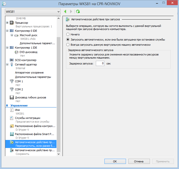 И если выбран автоматический запуск, то можно указать временную задержку, которая должна до старта ВМ. Эта задержка может потребоваться в том случае, если машины должны стартовать не все сразу, а в определенной последовательности.