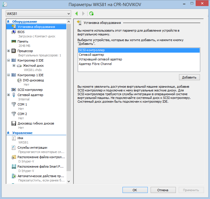 На вкладке «Установка оборудования» мы можем добавить виртуальной машине дополнительный SCSI-контроллер, а также сетевой или Fibre Channel адаптер. Для ВМ первого поколения при необходимости загрузки по сети можно добавить устаревший (legacy) сетевой адаптер.