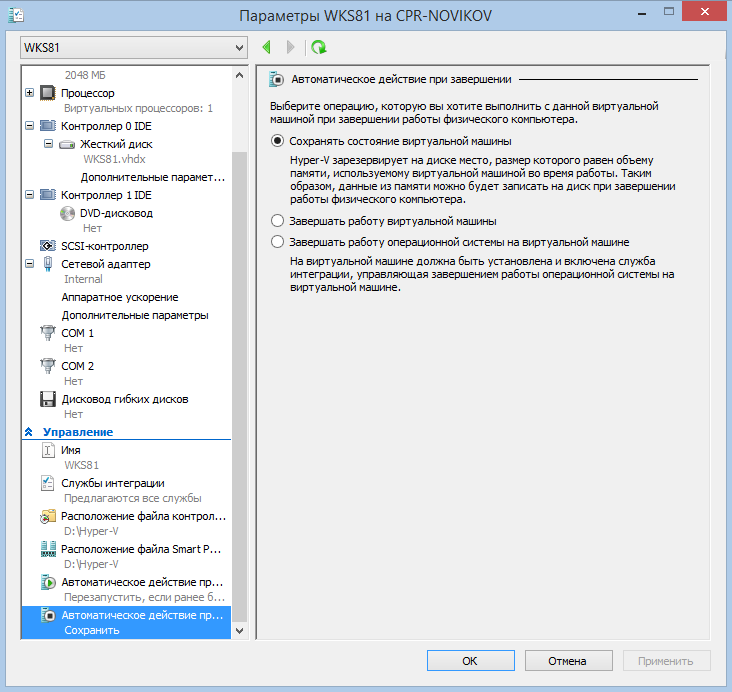 • Сохранять состояние виртуальной машины — при выключении состояние ВМ, включая содержимое памяти, сохраняется в файл. Соответственно при запуске виртуальная машина продолжит работу ровно с того момента, на котором была остановлена. Обратите внимание, что для обеспечения этого режима Hyper-V при старте ВМ резервирует место на диске, равное объему оперативной памяти, используемого этой машиной;