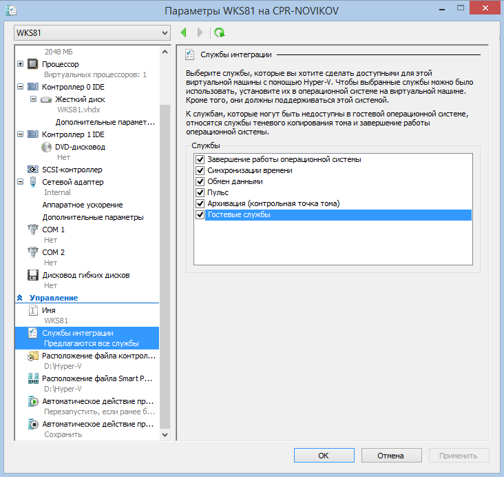 Cлужбы интеграции представляют из себя сервисы, которые запускаются в гостевой системе и взаимодействуют с хостом, обеспечивая возможность завершения работы ВМ из оснастки Hyper-V, синхронизацию времени с основной системой, проверку работоспособности машины (пульс), архивацию с использованием службы теневого копирования (VSS) и прочие полезные вещи. Для того, чтобы использовать эти возможности, службы интеграции должны быть установлены в гостевой операционной системе и этой системой поддерживаться.
