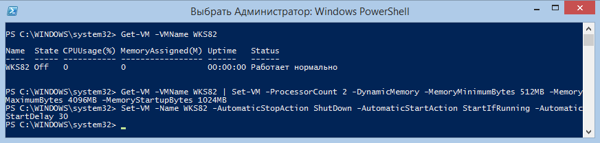 Get-VM -VMName WKS82Произведем настройки процессора и памяти: